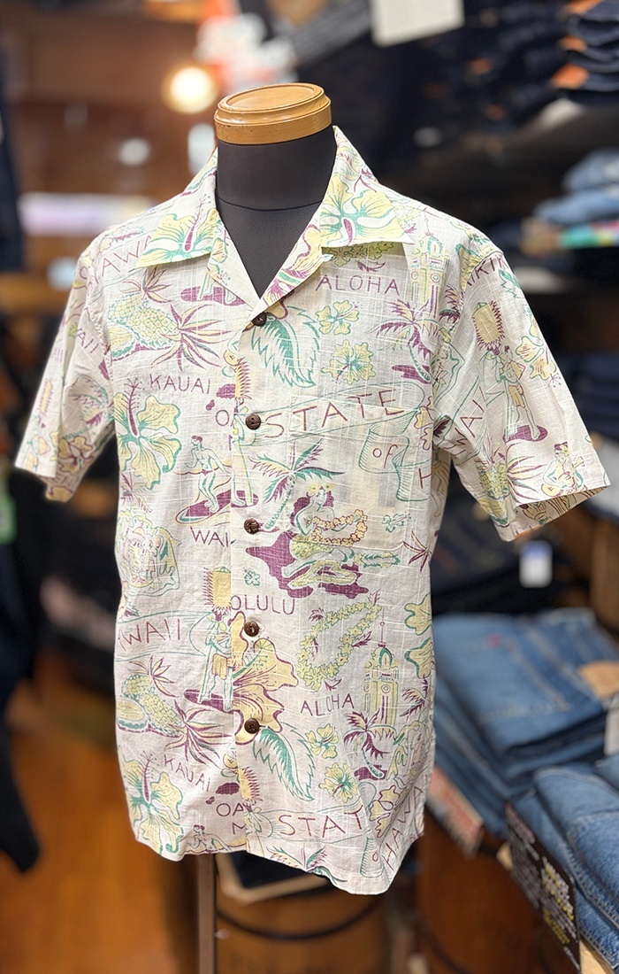 コレクターの心を鷲掴みにするチャプスイ・デザイン(ハワイ語でごちゃ混ぜという意味)をコットンリネン素材アロハにリバースプリントでプリントした製品です