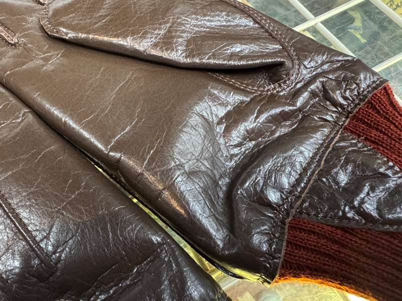 手首にはストレスの掛からないチューブ編みのウールニットが装着され、このニットには着用時に伸びを防ぐ補強用の当て革が縫い付けられています。