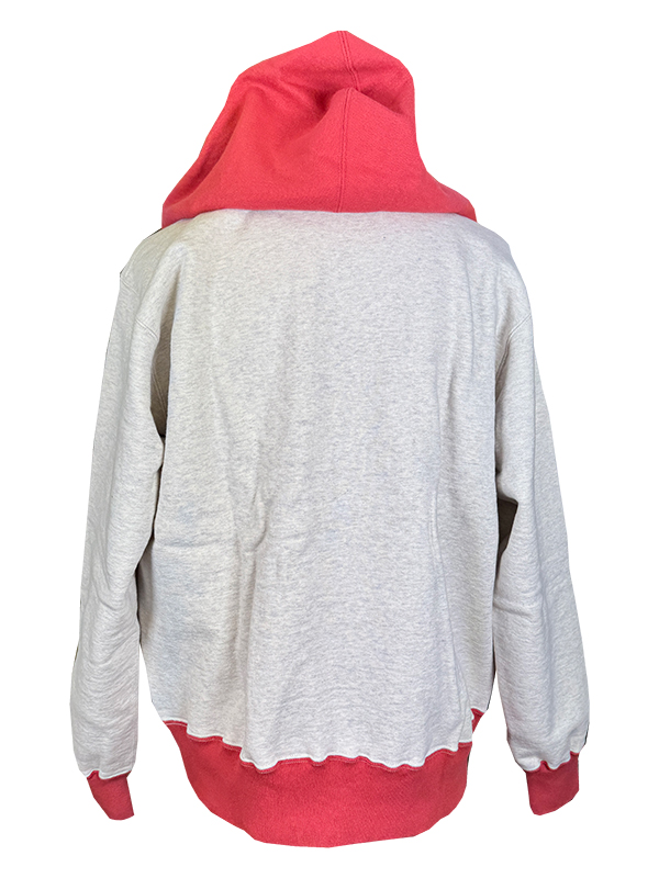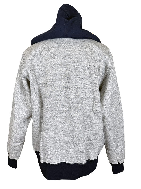 身頃は丸胴仕様で、リブは10番手の糸で編み立てられたリブを使用しています。フード部分の生地は1枚仕立てで、首元にはガゼットが付けられています。