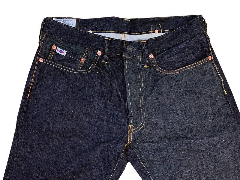 デッドストックバナーを解析し作られた13.5 Oz 米綿3州ブレンド 経 約7番×緯 約7番のデニムを使用です。