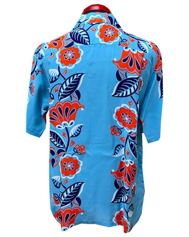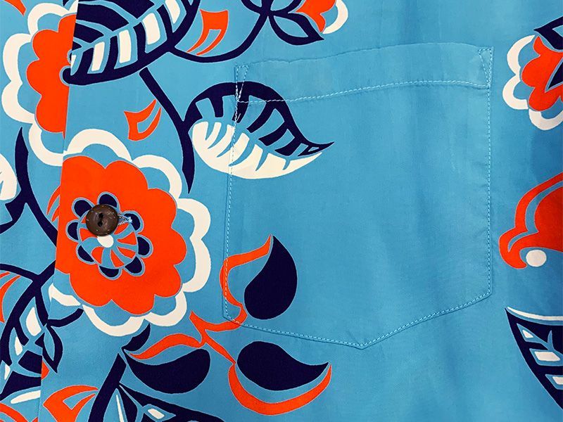 1940年代後期に作られたカメハメハ・ガーメント社の作品。抽象的なモチーフのボーダー・パターンはアロハシャツの歴史において初期の頃から登場し、伝統的なデザインとして様々な名作に用いられてきた。この作品もヴィンテージアロハシャツのマーケットでは価値が高く、非常にコレクタブル名一枚。それゆえリクエストも多く、今季の復刻を果たした。