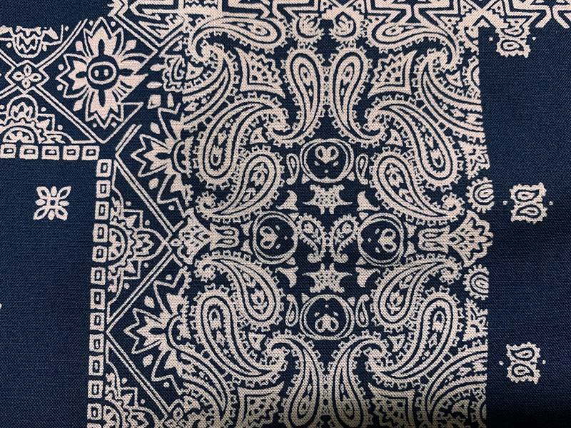 柄をよく見ると、幾何学柄の中に隠れ豚が混じり合うデザインのバンダナ柄になっています。