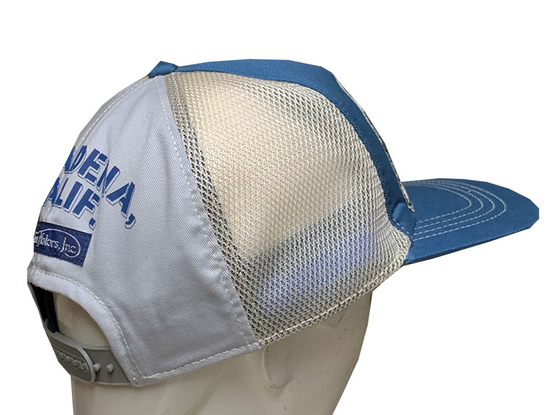ベルクロでサイズ調整が可能なメッシュキャップ。ワッペンが縫い付けられる前方の生地部分は、厚みのあるカラーチノ二枚とメッシュを重ねることで形崩れしにくいように設計しています。つばの芯も厚みのあるものを採用、つばの長さも長くデザインしました。レッド・ネイビー・イエロー・グリーンの4色は白いメッシュとの組み合わせで、つば裏は黒色です。ブラックのみ黒い色のメッシュに赤色のつば裏という配色になっています。