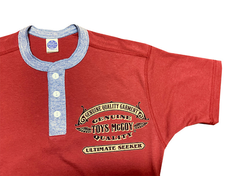 TOYS McCOYのロゴが左胸にワンポイント的にプリントされた、トイズマッコイのオリジナル仕様のヘンリーネックTシャツです。