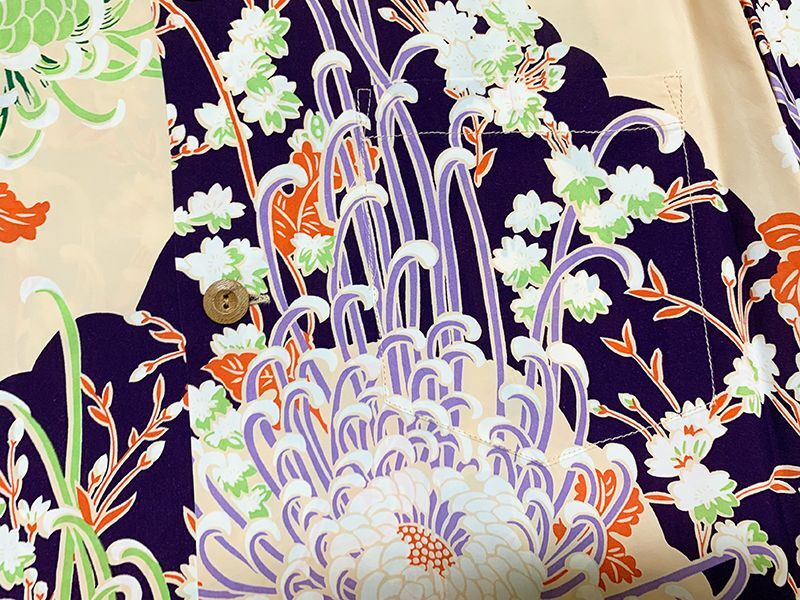 オリエンタル・デザインのアロハシャツには縮緬素材が使われることが多いのですが、こちらはフィラメント・レーヨンに菊の花を大胆に描いた珍しいデザインになっています。抜染と呼ばれる特殊な捺染の技法を用いて、モチーフとなる菊を染め抜くだけでなく立体感をも見事に表現されています。