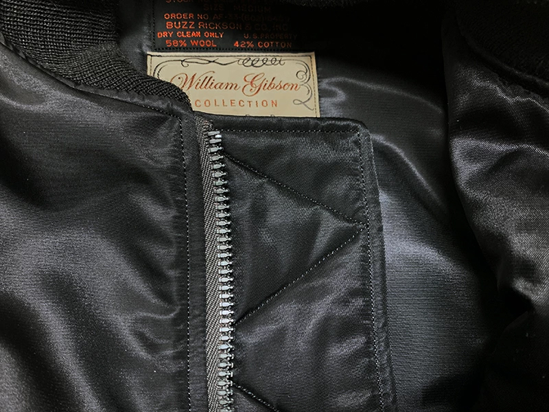 往年の味わい深いフライトジャケットを限り無く忠実に再現してきたBUZZ RICKSON'S が、何故史上に存在しない「BLACK MA-1」を作ったのでしょうか?それにはもちろん理由があり、2003年1月に欧米でBUZZ RICKSON'Sの代理店である「イ?ストマン社」から受けた、ある問い合わせのFAXが始まりでした。「BUZZ RICKSON'Sには黒のMA-1が存在するのか?」その様なわかりきった質問に、逆に疑問を感じ詳しく問いただしてみると、海外ではBUZZの黒いMA-1が何度も登場するからだと言うことが判明したのです。その小説家とはキアヌ・リーブス主演のSF映画「JM」の原作と脚本を書いたアメリカのベストセラーSF作家であるウィリアム・ギブソン氏で、彼の最新作「パターン レコグニション」には、高価なBUZZの黒いMA-1を大切に着ているケイスという名の主人公が登場していたのです。またウィリアム・ギブソン氏自身も実際にBUZZの製品を愛用しており、その魅力を理解した上で物語にBUZZを登場させていたのが分かったのです。