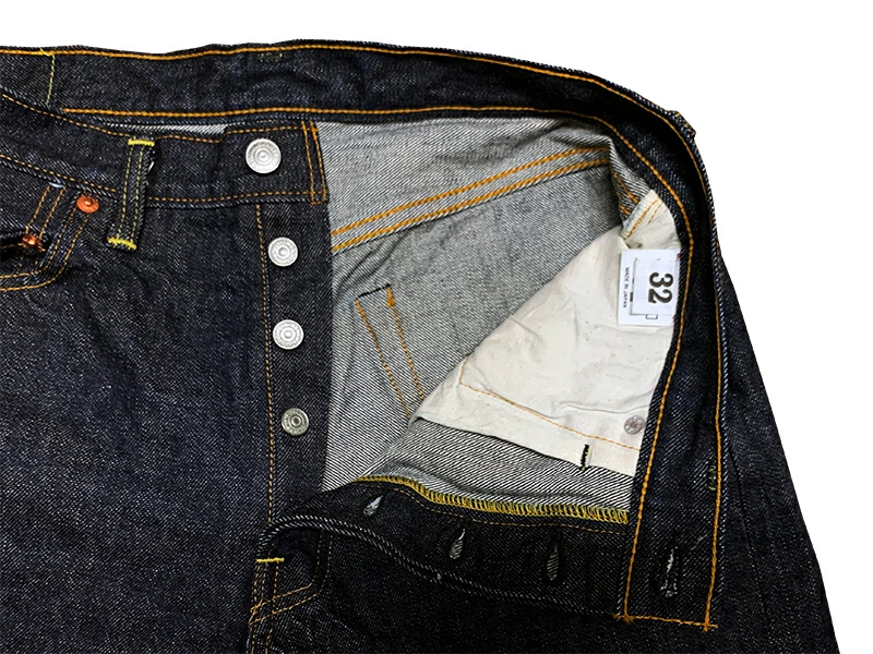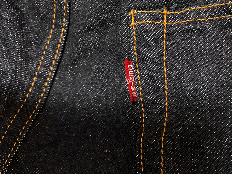 バックポケットのポケット裏リベットは無くバータック仕様で、紙タグの風合いや縫製糸の色使いやピスネームやボタンも創業時を再現を目指して生産されました。