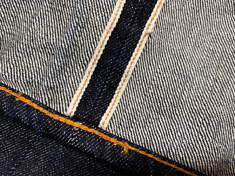 6 番×6 番 (クラボウ) セルヴィッチデニム:経糸6番×緯糸6番は同じですが 「XX モデル」「BIG E モデル」よりも打ち込み本数が少ない分、14.5オンスよりやや薄くなっています