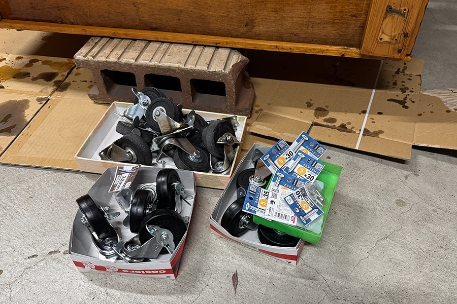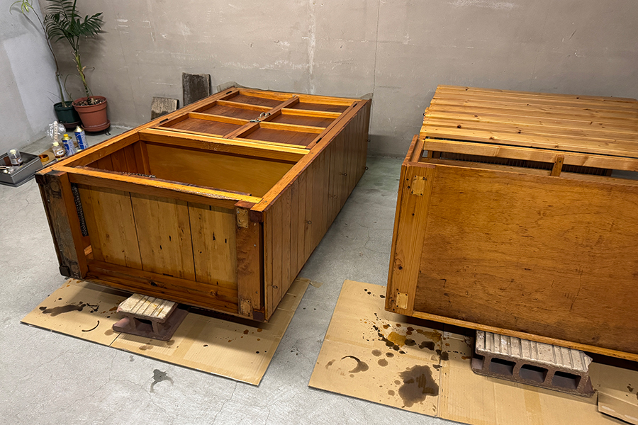 店頭の「2キロジーンズBOX」と「A-2BOX」のタイヤとニスを塗って綺麗にしております